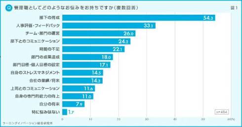 管理職の悩みについて、最も多い回答は「部下育成」で、54.3%だった。「人事評価・フィードバック」(33.1%)、「チーム・部門の運営」(26.0%)と続いた。