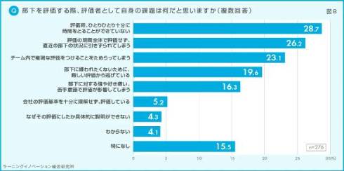 部下を評価をする際、管理職はどのような課題を感じているのか。「一人一人十分に時間をとることができていない」(28.7%)、「評価期間全体で評価せず、直近の状況に引きずられてしまう」(26.2%)、「チーム内で極端な評価をつけることをためらってしまう」(23.1%)といった回答が上位を占めた。