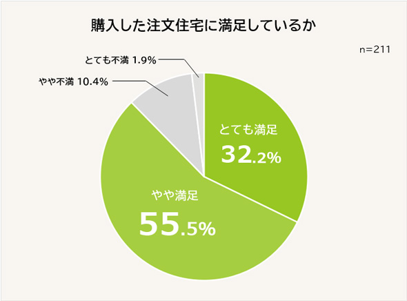 「購入した注文住宅に満足しているか」については、「とても満足」「まあ満足」と答えた人は合わせて87.7%。注文住宅にして良かったと感じている人が多いようだ。
