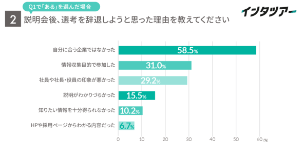 回答者からは「思っていたイメージと実態が異なっていた」「自分には合わないと思った」などの声があり、説明会の段階で企業とのフィット感を判断する人が多いことが読み取れる。