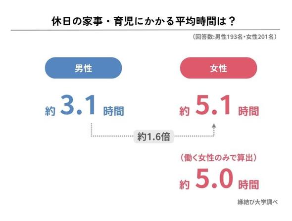 仕事がない休日に家事・育児にかかる時間を男女で比較すると、男性が平均3.1時間、女性は5.1時間となり、女性の方が約1.6倍長いことが明らかとなった。また、仕事をしている女性の休日の家事・育児時間は約5.0時間で、仕事の有無による大きな差は見られなかった。