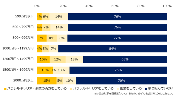 本業以外の活動(パラレルキャリア/副業)について、25%が「している」(パラレルキャリア・副業の両方をしている:5%、パラレルキャリアをしている:7%、副業をしている:13%)と回答。年代別では40代、年収別では「1200万〜1499万円」の層で実施率が高いことが分かった。