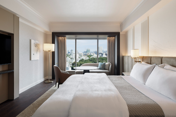 客室は、デラックス、エグゼクティブをはじめ、プレジデンシャルスイート、インペリアルスイートなどスイートを含むすべてのゲストルームをリニューアル。室内にいながら豊かな緑を想起させるインテリアで、心地よい寛ぎの空間として生まれ変わったという。