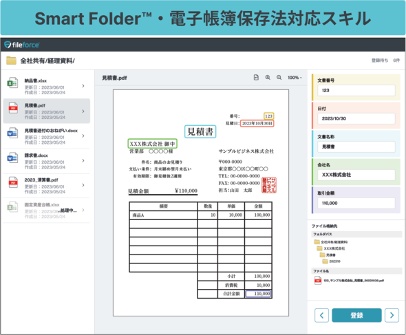 Smart Folder™で利用できるスキルの第1弾として登場したのが、「電子帳簿保存法対応スキル」だ。電子帳簿保存法(電帳法)対応のために必要なファイル操作をAIが肩代わりして、業務を大幅に自動化できる仕組みだ。