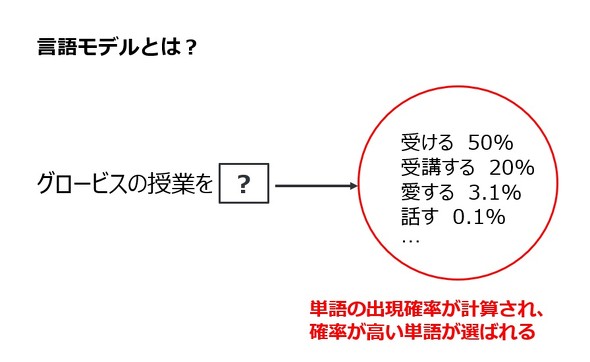 言語モデルとは、大量の言語データを学習して、一連の単語の並びから次の単語を予測するという考え方です。AIを自然言語(コンピュータ向けのプログラミング言語のような人工言語との対比でこう呼ばれています)の処理に使おうとする試みのベースになるものです。