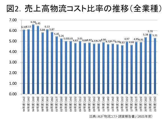参考までに、世の中の「売上高物流コスト比率」のデータ推移を以下に紹介する。