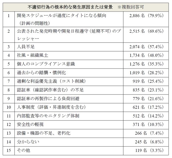アンケート調査では、同社内で不適切な事象が発生した原因や背景事情について、 15項目の選択肢から選択(複数選択可能)して回答を求めるとともに、自由記載欄を設けて質問された。その中で、回答数の多い項目順に並べたのが次の表だ。