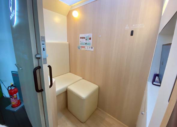サイズは畳一畳分。ソファと小さめのイスが1つ置かれており、モニターやコンセントもある。鍵付きの完全個室なので、安心して授乳やオムツ替えができそうだ。筆者が滞在していた1時間の間に親子がひっきりなしに訪れ、3〜4組が利用していた。