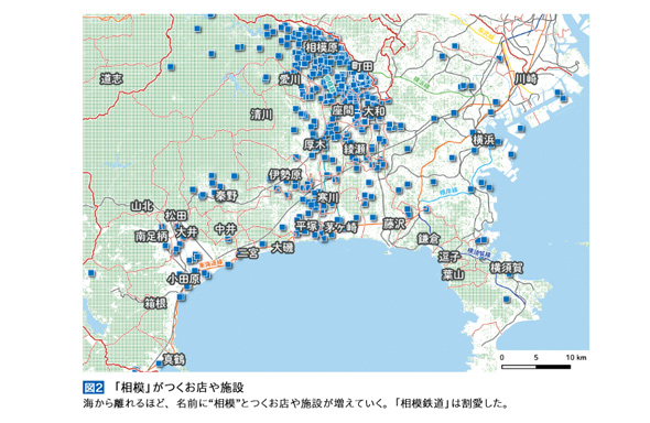 「相模」がつくお店や施設を地図にすると、神奈川県の県央、県北地域に印がたくさんつきました(図2)。湘南ほど広範囲に広がっているわけではありませんが、こちらもなかなかの存在感です。