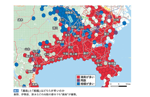 各地域で「湘南」と「相模」、どちらが多いのかを比べてみると、おおむね相鉄線のあたりに分水嶺(2つの“流域”をへだてる尾根)があるようです(図3)。
