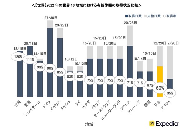 各国の休暇取得状況の調査を毎年行うエクスペディアによれば、22年の日本の有給取得率は米国に次いでワースト2位だった。