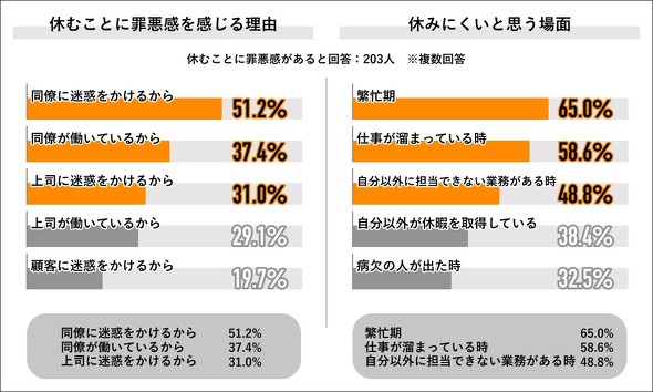 それでも休みづらいのは、「周りの人に悪い」という理由が大きいようだ。「2023年 日本人の休み方実態調査」でも、罪悪感を感じる理由の上位に「同僚に迷惑をかけるから」(51.2%)、「同僚が働いているから」(37.4%)、「上司に迷惑をかけるから」(31.0%)がきている。