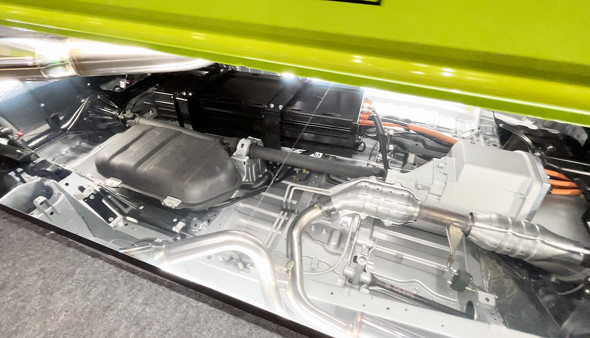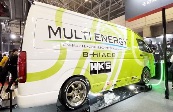 日本を代表するチューニングパーツメーカーのHKSは、「ハイエース」をPHEV化するだけでなく、LPGや合成燃料、水素まで燃やせるマルチフューエル仕様にして持ち込んだ。スペースに余裕があることからできる限り多くの種類の燃料を利用できるようにするというのは、デモカーとはいえユニークな試みだ。