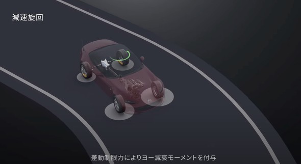 マツダのいうアシンメトリックLSDは、これまでのセオリーに反し、減速時の方をより強く拘束するというこれまでになかった発想のLSDである。従来のLSDの主目的が駆動力を伝えることだったのに対し、アシンメトリックLSDは、姿勢制御が主目的なのだ。