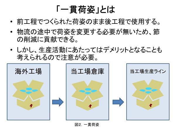 長距離輸送を伴う物流でよく採用される、物流効率化のための発想である。この考え方を工場で当てはめると、協力サプライヤーの生産工程で作られた荷姿を途中で変更することなく自社の生産工程まで運んでくることになる。すると、物流の観点で見れば極めて望ましい「節なし物流」を実現できるのである。