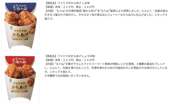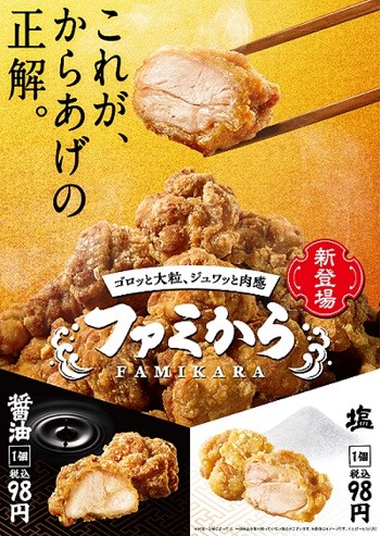 22年5月には、和風からあげに代わる新商品として「ファミから」を発売し、現在は醤油味・塩味の2種類をそれぞれ1個98円で販売している。地域ごとにサイズが異なるようで、ファミから(醤油)の場合は北海道・関東・中四国・九州・沖縄だと1個につき約103キロカロリー、東北・東海・北陸・関西だと約125キロカロリーである。ちなみに、セブンの通常のななからは82キロカロリーだ。
