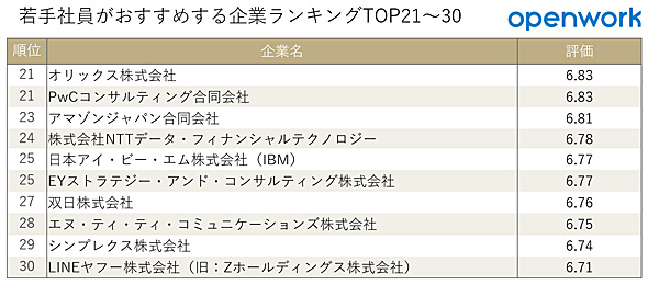 集計対象は、直近3年間の20代新卒入社者による回答。自社を「どれくらいおすすめできるか」という観点から回答するNPSスコアの高い企業ランキングは、以下の通りとなりました。