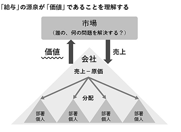 お客様に価値を提供して、会社に利益が入ってくることで、最終的にその利益が給与として分配されます。給与は、自分が生み出した価値をお客様に与えたことによる利益の分配であること、つまり「給与」の源泉が「価値」であることを理解せず、その反対の意識で仕事をしていたら、あなたの給与は一生上がりません。