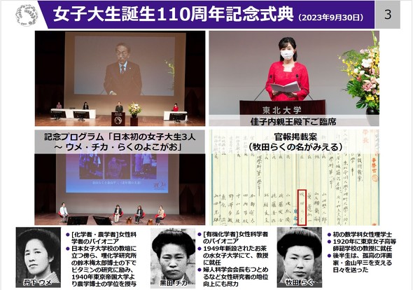 ――東北大は開学の理念の一つに「門戸開放」を掲げ、1907年の開学から6年後の13年に黒田チカ、丹下ウメ、牧田らくという3人の女性の学生を日本で初めて受け入れました。ダイバーシティーを100年以上前から重視していたといえますし、今の時代にも通ずるところですね。