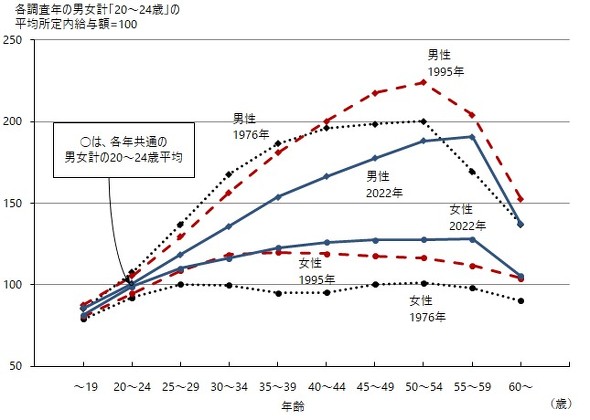 男性の場合は以下のグラフを参照していただきたい。1995年は45〜49歳は206.2と、20〜24歳の2倍の賃金をもらっていたが、2022年は176.0にまで下がっている。50〜54歳も1995年に212.2と2倍超の賃金をもらっていたが、2022年は186.3にまで下がっている。