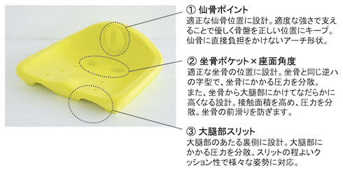 同社の独自理論である「三点支持理論」を応用し、崩れがちな子どもの姿勢を、骨ポジションを安定させることで背筋が伸びた理想的な座姿勢に導く仕様とした。坐骨・仙骨・大腿骨の3点で姿勢と圧力バランスを整え、仙骨と坐骨をホールドすることで、長時間でも自然に骨盤の立った理想の姿勢をキープできるという。