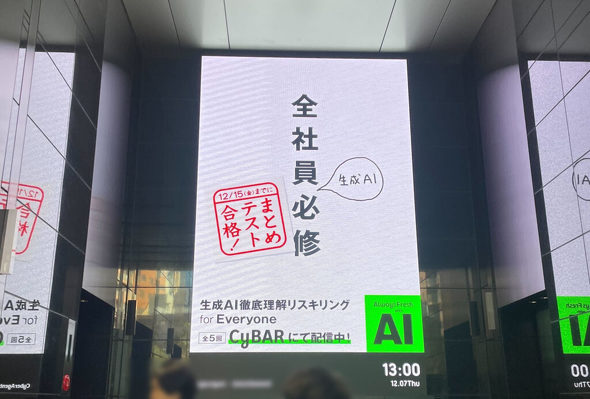 小枝さんは「あの手この手を使って周知に取り組んだ」と振り返る。まずは社内チャットツールのSlackとメールで、リスキリングプログラムが始まることを告知。スタート後は社内デザイナーらと連携して作った「全社員必修」と記されたサイネージを社内展開した。各部署の会議にも顔を出し、リスキリングを受講してもらうよう何度も共有したという。
