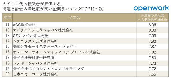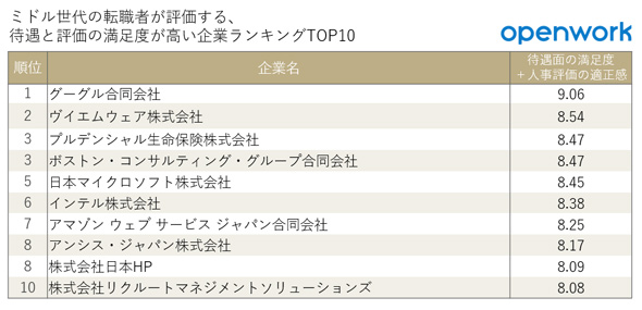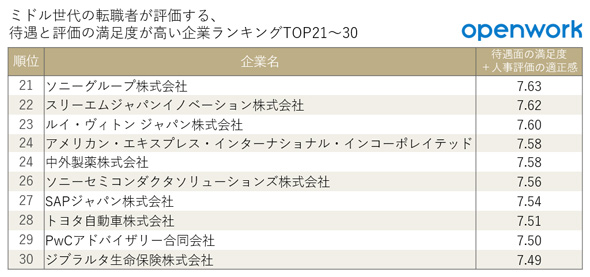直近3年間を振り返って、40〜50代の中途入社者の回答をまとめました。OpenWorkの8つの評価項目のうち、「待遇面の満足度」「人事評価の適正感」の合計スコアが高いTOP30社を抽出しました。