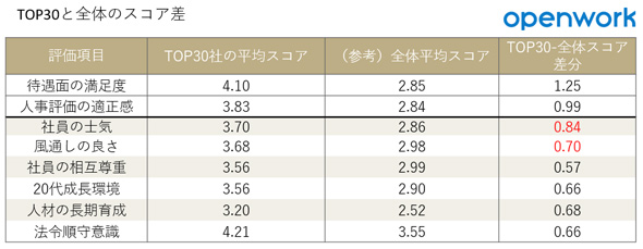 TOP30社のスコアと、他の企業も含めた全体の平均スコアを比較すると、TOP30社は「社員の士気」「風通しの良さ」のスコアが高い傾向にあることが分かります。