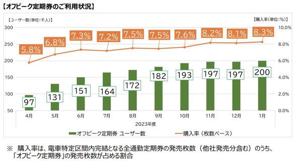 オフピーク定期券の購入率は、3月が通勤定期券購入者全体の5%、4月は6%でわずかながら伸びた