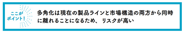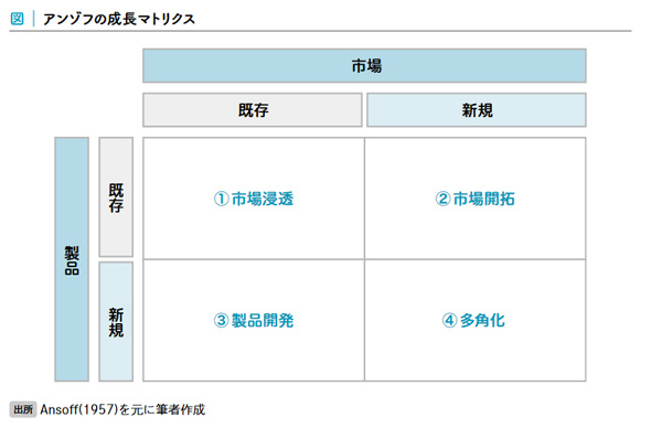このフレームワークは「製品」と「市場」の2つの軸で構成され、それぞれを「既存」と「新規」に分類した4象限で表現されます。
