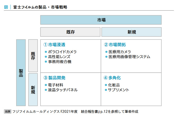 2007年に富士フイルムから発売されて話題になった化粧品「アスタリフト」は、フィルム製造技術を用いて開発された製品であり、(4)多角化(新規市場×新規製品)の成功例です。