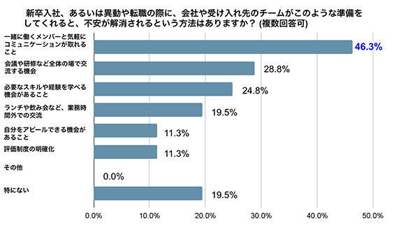 感じている不安が解消すると感じる取り組みでは「一緒に働くメンバーと気軽にコミュニケーションが取れる」(46.3%)が1位に。2位は「会議や研修など全体の場で交流する機会」(28.8%)、3位は「必要なスキルや経験を学べる機会がある」(24.8%)が続いた。