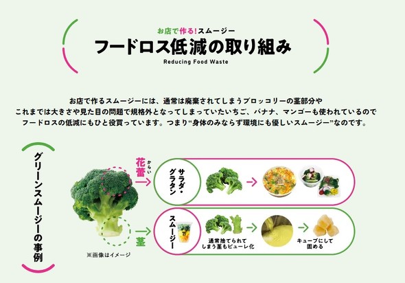セブンがスムージーを強化する狙いには、フードロス低減もある。例えば、ブロッコリーをサラダなどに加工する際、通常だったら廃棄されてしまっていた茎をグリーンスムージーに利用している。