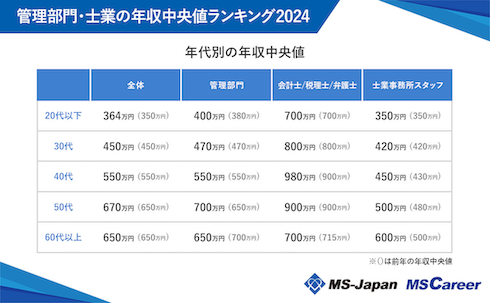 MS-Japan(東京都千代田区)は、「管理部門・士業の年収中央値ランキング2024」を発表した。職種・資格別の年収中央値の1位は「公認会計士」(950万円)、2位は「弁護士」(800万円)、3位は「経営・戦略コンサルタント」(720万円)だった。