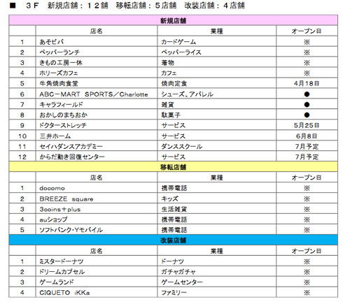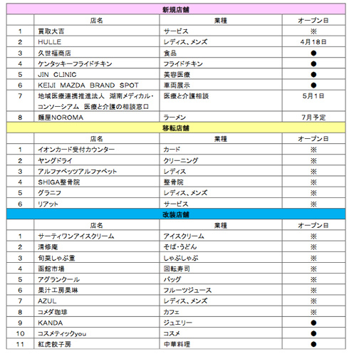 1階レストラン街には、フライドチキン専門店「ケンタッキーフライドチキン」、奈良市で人気の鶏白湯ラーメン専門店「麺屋NOROMA」が新規出店。3階フードフォレストには、牛角がプロデュースするフードコート専門店「牛角焼肉食堂」、ペッパーライスが看板メニューの「ペッパーランチ」が滋賀県初出店する。