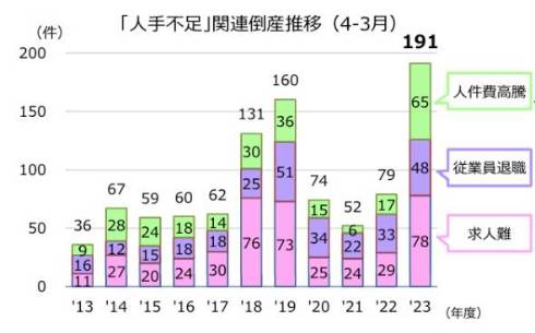 2023年度(23年4月〜24年3月)の「人手不足」関連による倒産は191件(前年度比141.7%増)と前年度の2.4倍に急増。19年度の160件を大幅に上回り最多を更新したことが東京商工リサーチ(東京都千代田区)による調査で明らかとなった。