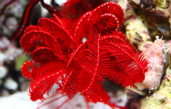 例えば、5階を見てみよう。先ほど紹介したように43本の水槽が並んでいるわけだが、それぞれに特徴がある。「ヘコアユ」は頭を下に向けて泳いでいるし、エリンギのようなカタチをしている「イソンギンチャク」もいるし、見た目がもさもさしている「ウミシダ」もいるし、ぺったんこのカエル「ピパピパ(コモリガエル)」もいる。