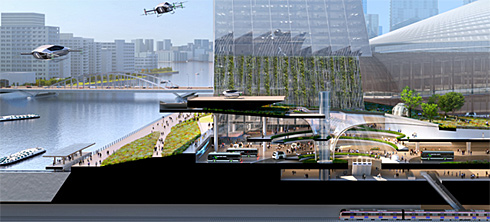 また、浜離宮恩賜庭園や隅田川などの周辺資源を生かした約10ヘクタールのオープンスペースを整備し、子どもからお年寄りまで多くの人が集い、楽しめる空間を整備。陸・海・空のモビリティが乗り入れ可能な広域交通結節点を整備し、築地場外市場と連動したにぎわいと交流を促進する。最先端の環境技術を活用したカーボンニュートラルの達成、多様な環境配慮にも取り組むという。