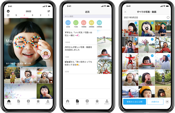 「みてね」は、容量無制限かつ無料で写真や3分以内の動画を共有できるアプリだ。祖父母や親せきなど、招待した家族だけにリアルタイムで共有が可能。共有された写真にコメントやスタンプを付けたり、誰が見たのかを確認できたり、コミュニケーション機能も付いている。共有されている写真や動画が、圧倒的に子どもの内容が多い点が他の共有サービスと決定的に違うところだという。