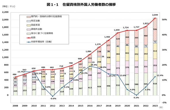 2023年10月時点で外国人労働者は204万8675人と初めて200万人を超えて過去最多となった。前年比で12.4%増加し、2013年からは11年連続で過去最多を更新している。