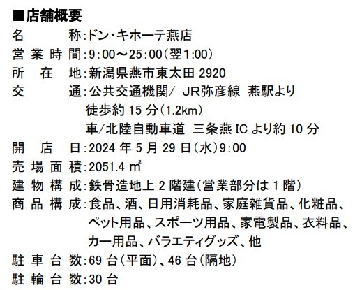 ドン・キホーテ(東京都目黒区)は5月29日、新潟県燕市に県央エリア初となる「ドン・キホーテ燕店」をオープンする。自治体による子育て支援制度が充実し、おしゃれに敏感なニューファミリー層が多いと同社は分析。最新のトレンド品や地元愛をくすぐるような取り組みを展開していくとしている。