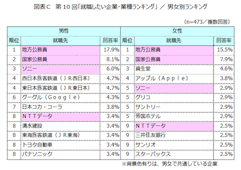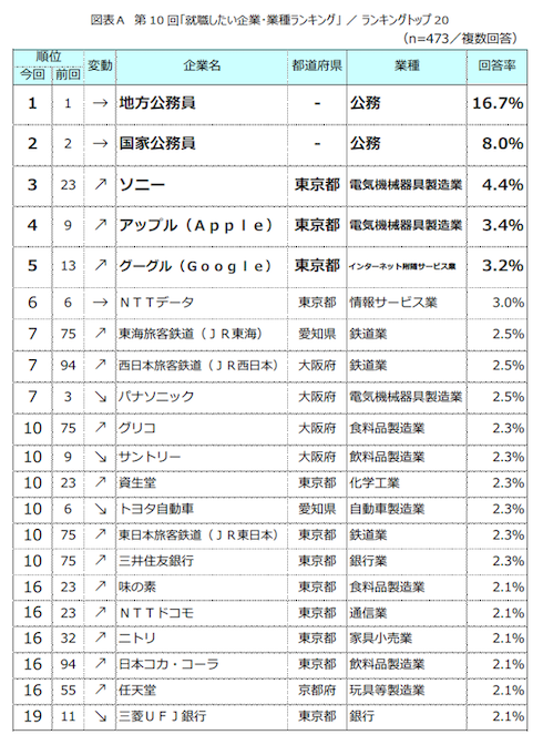 3位以下は「ソニー」(4.4%)、「アップル」(3.4%)、「グーグル」(3.2%)が続いた。その他、鉄道業では「東海旅客鉄道」(前回75位→今回7位)や「西日本旅客鉄道」(同94位→同7位)が前回の調査から順位を上げた。また、飲食料品製造業では「グリコ」(同75位→同10位)、「味の素」(同23位→同16位)なども人気を高めている。一方、「講談社」(同13位→同63位)、「集英社」 (同19位→同39位)など、出版社のランクダウンが目立った。