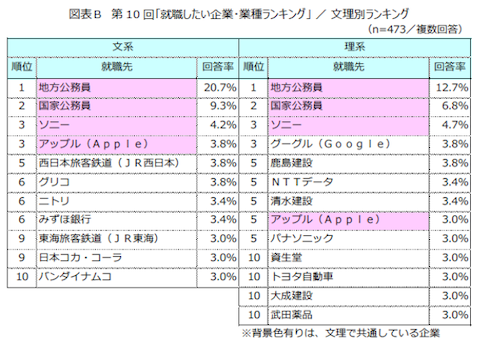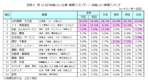 文系・理系別ではともに「地方公務員」と「国家公務員」が1〜2位を獲得。その他、文系では「飲食料品製造業」や「鉄道業」に人気が集まった。理系は「建設業」が3社ランクインした。