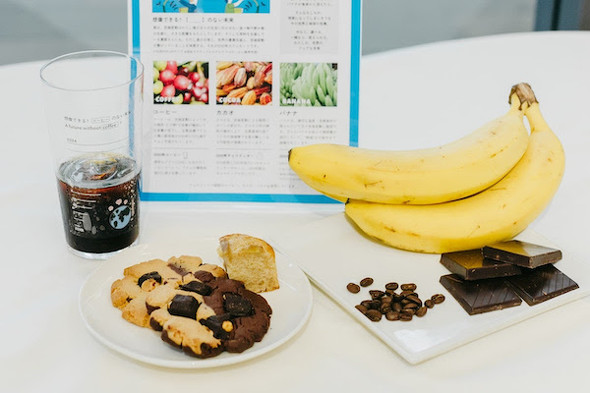 会場では気候変動がさらに進んだ2050年の状況をイメージし、グラスに半分しか注がれていないアイスコーヒーや、チョコレートの量が極端に少ないチョコクッキー、病害により絶滅の危機に瀕しているとされるバナナの状況を踏まえ、通常の4分の1サイズしかない甘酒入りのバナナケーキなどが提供された。