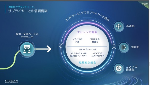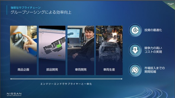 そして日産が連携を深めるのは自動車メーカーだけではありません。部品を購入するサプライヤーとの連携も今回の新中計で強調されたことの1つ。EVの開発には多額の費用がかかり、新しいパワートレインであるがゆえに、未知の開発をしていかないといけない点も多々あります。自動車メーカーは自動車全体に関する知見は十分に持っているものの、部品単品に限れば、それぞれのサプライヤーの持つ知見の方が大きいことも多々あります。