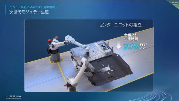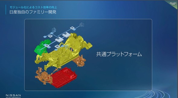 新しく取り組むEVでは、自動車のつくり方そのものを変えていく取り組みも発表されています。ポイントは「プラットフォーム」と「モジュール化」です。上記に挙げたルノー/三菱自動車と連携して開発を進めているEV向けのプラットフォーム。プラットフォームを共有化することで、後続モデルの開発費を50%、トリム部品のバリエーションを70%+開発期間を4カ月削減。