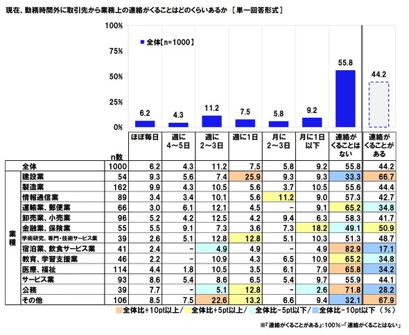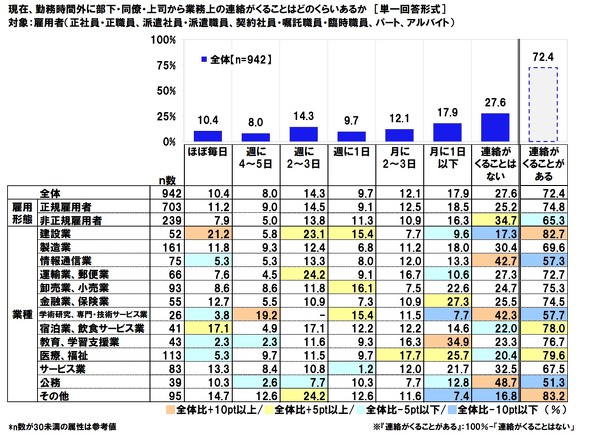 2023年9月に連合が行った調査によると、雇用者のうち72.4%が「勤務時間外に部下・同僚・上司から業務上の連絡がくることがある」、44.2%が「勤務時間外に取引先から業務上の連絡がくることがある」と回答している。ほぼ毎日くるという人はそれぞれ10.4%、6.2%だ。