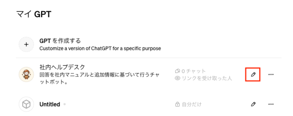 作成済みのGPTsに新たな条件を追加することも可能だ。GPTストア右上の「マイGPT」をクリックすると自分が作成したGPTsの一覧が表示され、編集したいGPTsのペンのアイコンをクリックすれば作成画面に移動できる。