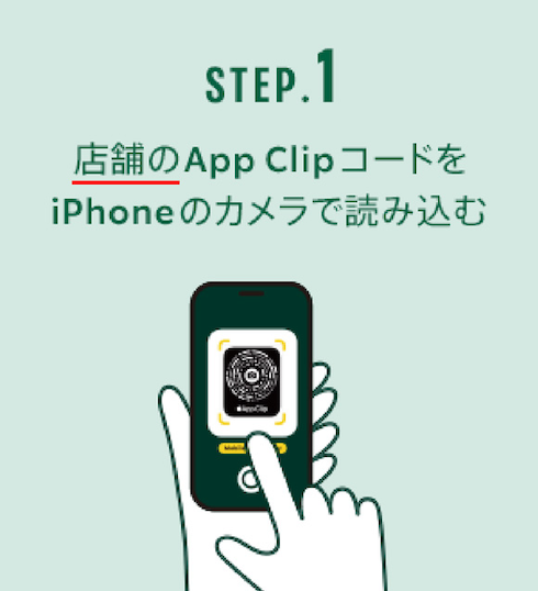 今回、App Clipを導入することで、会員登録やアプリのインストールをしなくてもMobile Order & Payの利用を可能にした。店内にあるApp ClipコードをiPhoneのカメラで読み込むだけで、Mobile Order & Payが起動するので、注文とApple Payでの決済まで行うことができる仕様だ。