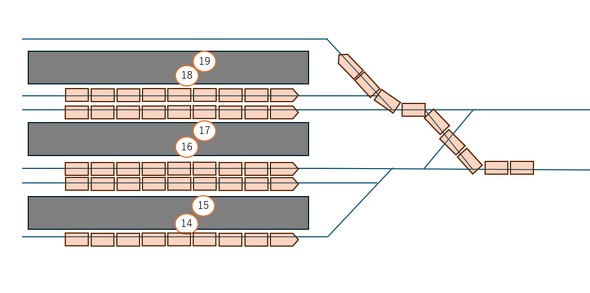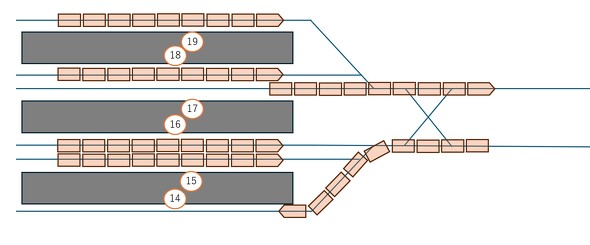 東京駅の東海道本線のプラットホームは3面あり、それぞれの両側に線路がある。つまり3面6線の容量だ。のりばは丸ノ内側から14〜19番線となる。東海道新幹線は複線で左側通行だ。上り列車が14番線に到着する場合は、17、18、19番線から下り列車が発車してもすれ違いが可能だ。15番線と16番線は上り列車に分岐器がふさがれてしまうから、上り列車が14番線に到着して停止するまで動けない。分岐器をふさがれたせいで他の列車が動けなくなる状態を「交差支障」という。